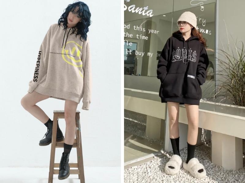 Phong cách giấu quần với áo hoodie oversize là xu hướng được nhiều fashionista ưa chuộng. Chỉ cần chọn hoodie dài ngang đùi, mix cùng bốt cổ cao hoặc sneaker cổ cao là bạn đã có set đồ gợi cảm mà vẫn năng động. Nên chọn hoodie màu trung tính hoặc pastel để tạo cảm giác nhẹ nhàng, không phản cảm.