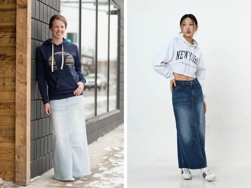 Chân váy denim kết hợp hoodie mang lại phong cách vừa retro vừa năng động. Nàng có thể chọn váy dáng chữ A hoặc dáng ôm nhẹ, phối cùng giày thể thao trắng hoặc boots cổ ngắn. Set đồ này giúp bạn trông trẻ trung, tự nhiên mà vẫn rất có gu.