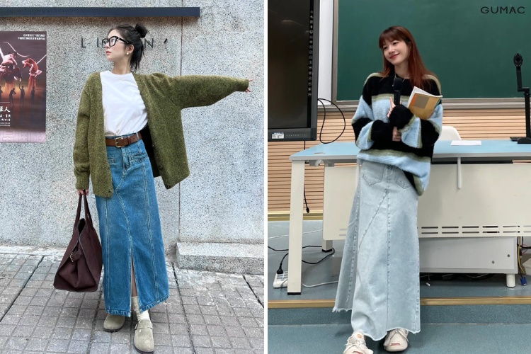 Cardigan mỏng, dáng lửng hoặc dài ngang hông phối với chân váy jean dài là công thức “nửa thu – nửa đông” rất phù hợp với thời tiết se lạnh. Bên trong có thể mặc thêm áo giữ nhiệt hoặc áo hai dây mỏng.