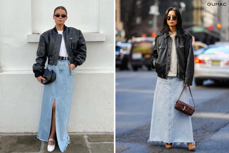 Bomber dáng ngắn khi kết hợp với chân váy jean dài mang lại vẻ khỏe khoắn, phóng khoáng nhưng vẫn giữ được nét gọn gàng. Nên chọn bomber tối màu, trơn hoặc có hoạ tiết đơn giản, đi kèm váy jean xẻ tà hoặc dáng suông.