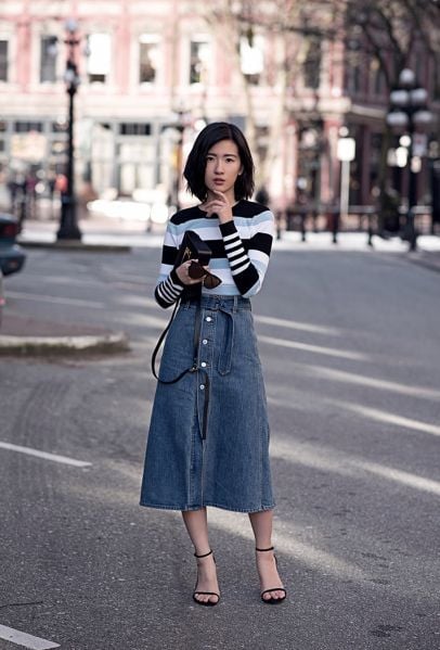 Sweater dáng lửng phối chân váy jean dài cạp cao giúp kéo dài tỷ lệ cơ thể, làm người mặc trông cao và thon hơn. Phối cùng giày búp bê và túi baguette rất hợp cho phong cách năng động, Hàn Quốc.