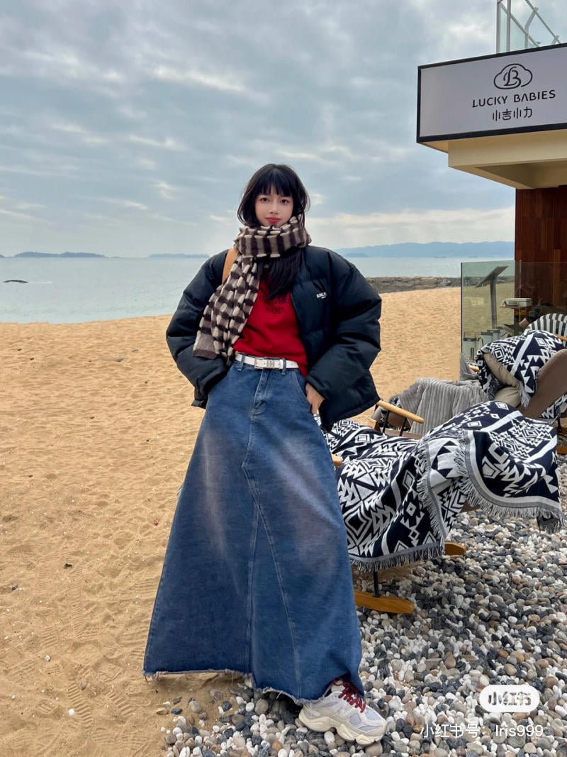 Q: Có nên phối chân váy jean dài với áo khoác phao hoặc áo lông không?