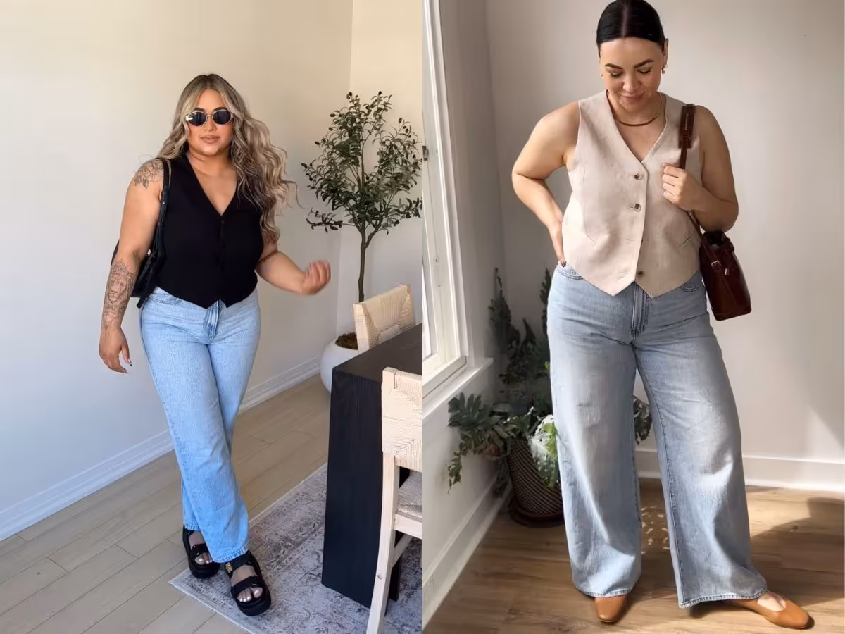 Áo vest không tay tạo cảm giác thân hình thẳng đứng hơn, cực kỳ hợp cho người có vai to. Khi mix cùng quần palazzo và giày cao gót, outfit trông hiện đại, thanh mảnh và quyền lực.