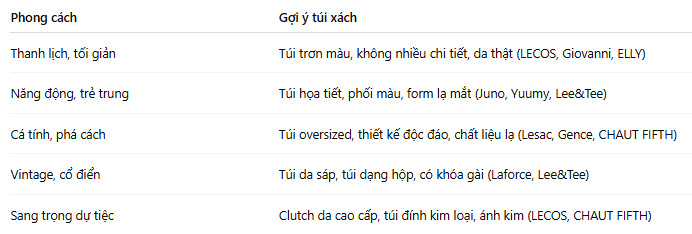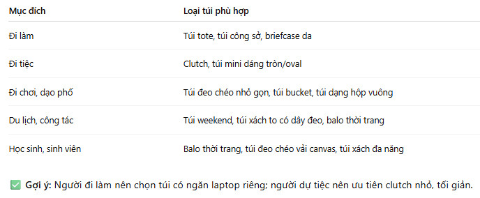 Gợi ý: Người đi làm nên chọn túi có ngăn laptop riêng; người dự tiệc nên ưu tiên clutch nhỏ, tối giản.
