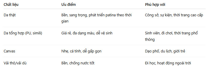 Gợi ý: Người thường xuyên di chuyển nên ưu tiên túi canvas hoặc da tổng hợp để tránh trầy xước, dễ vệ sinh.