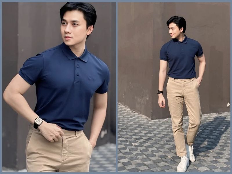 Nếu quần kaki dáng slim-fit, hãy chọn polo ôm vừa phải để tổng thể hài hòa. Set đồ này đặc biệt phù hợp cho những buổi hẹn cuối tuần hay gặp gỡ bạn bè tại quán cà phê.