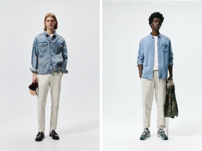 Áo khoác jeans khi mix cùng quần kaki tạo nên outfit trẻ trung và cá tính. Bạn có thể kết hợp quần kaki be với áo thun trắng, khoác ngoài jacket jeans xanh, đi cùng sneaker trắng để có diện mạo năng động. Nếu chọn quần kaki tối màu, hãy ưu tiên jacket jeans sáng để tạo sự tương phản nổi bật.