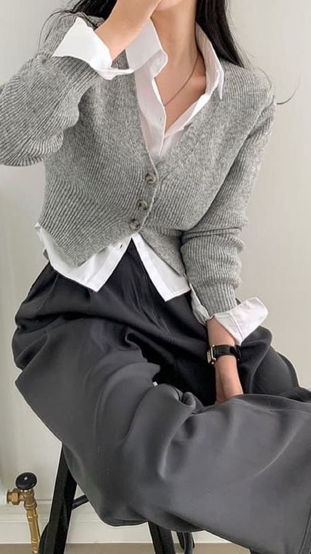 Cardigan hoàn toàn có thể xuất hiện trong môi trường công sở nếu bạn biết cách phối. Áo sơ mi trắng, quần tây ống đứng và cardigan mỏng màu trung tính sẽ tạo nên outfit thanh nhã mà vẫn ấm áp.