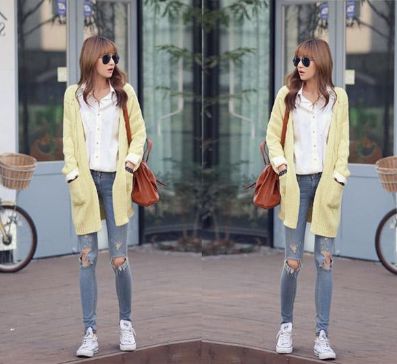 - 15. Cardigan len + quần jeans rách