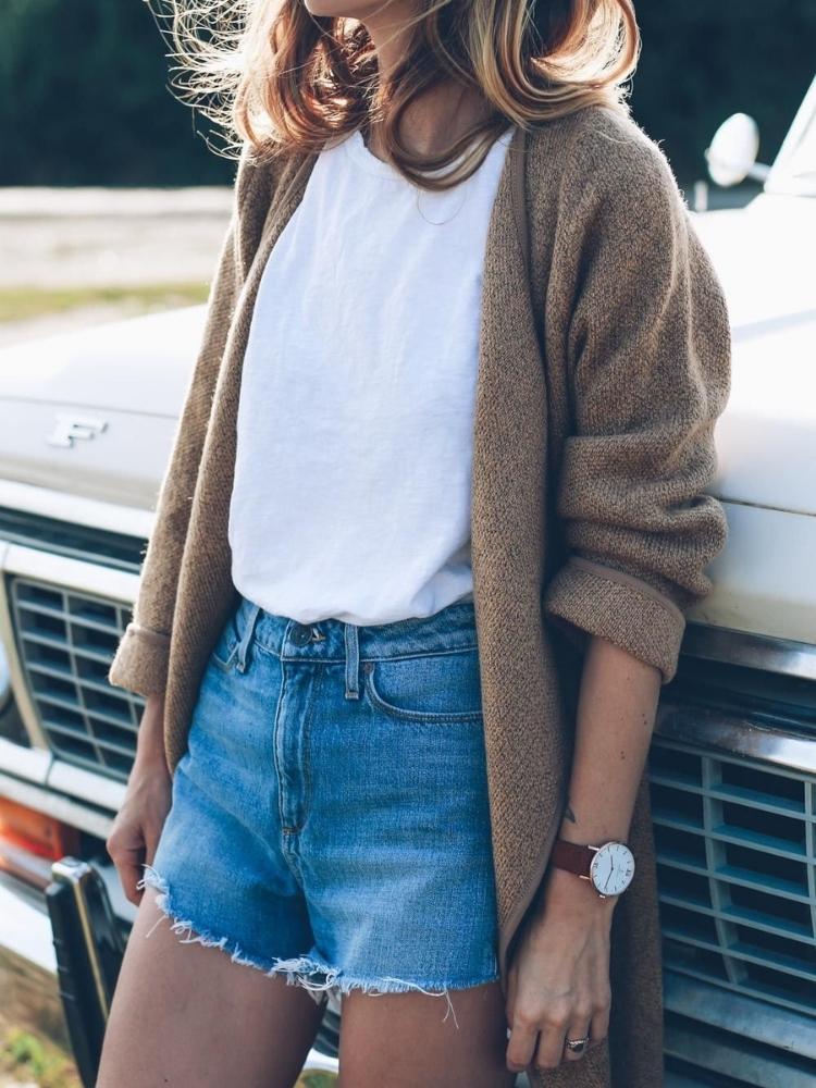 Đây là công thức mix đồ đơn giản nhưng cực kỳ hiệu quả cho những ngày nắng đẹp. Cardigan khoác ngoài áo thun trắng basic, mix cùng quần short jeans và sneaker là đủ để bạn tỏa sáng.