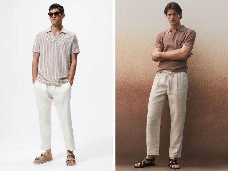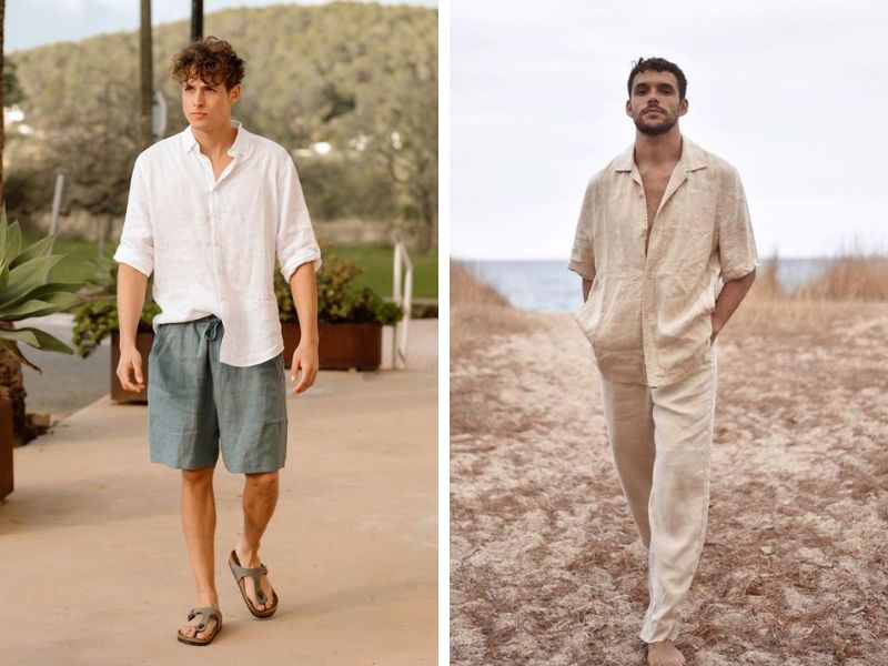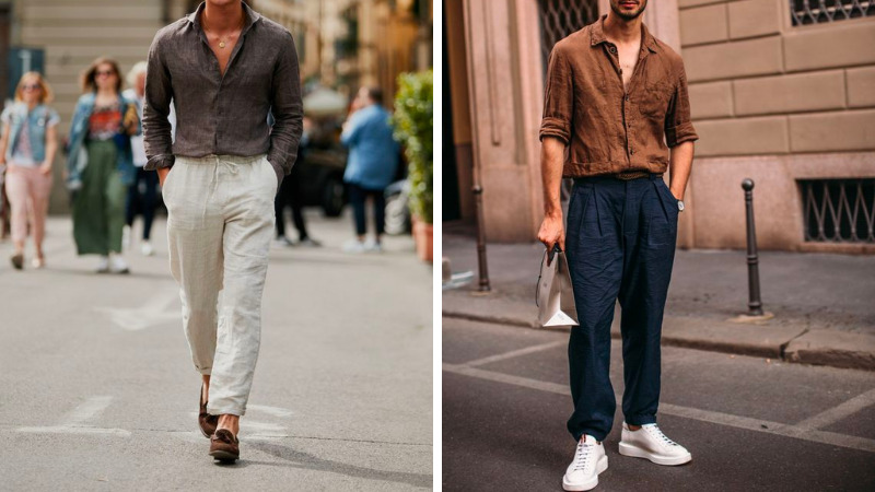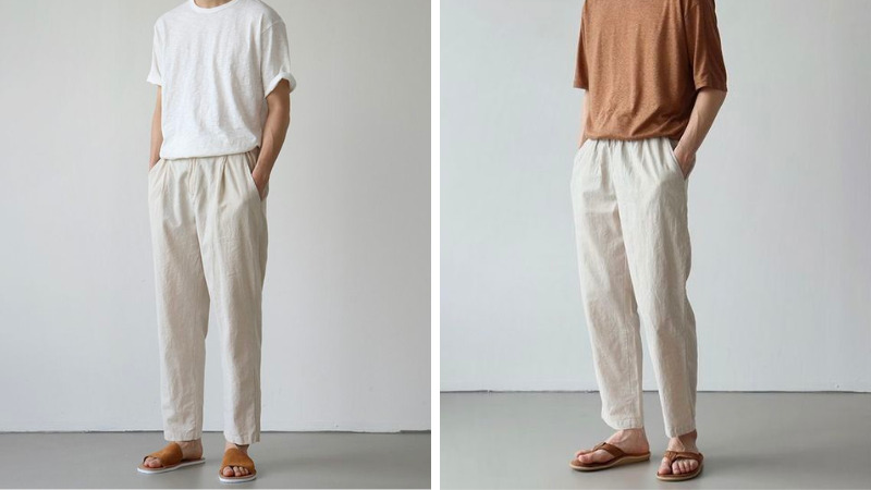 Bộ đôi linen – đũi là “signature look” của phong cách tối giản. Chọn sơ mi linen cộc tay, phối thêm túi tote vải và dép sandal da. Đây là outfit hoàn hảo cho những chuyến đi biển hoặc dạo phố cuối tuần.