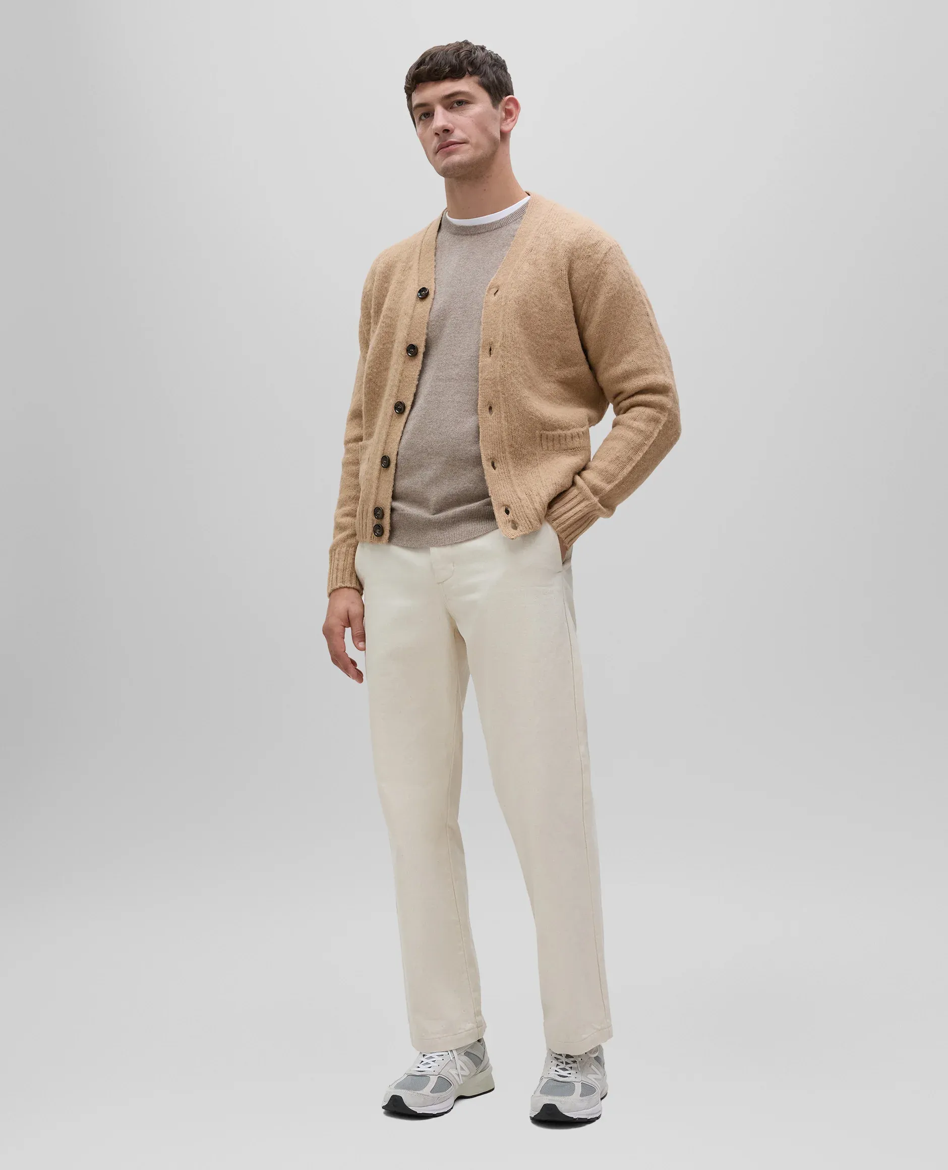 Outfit hợp cho những sáng thu. Áo len mỏng cổ tròn mix quần đũi màu be hoặc nâu, phối thêm túi tote da, giày loafer, dây lưng nam da thật để look thêm tinh tế.