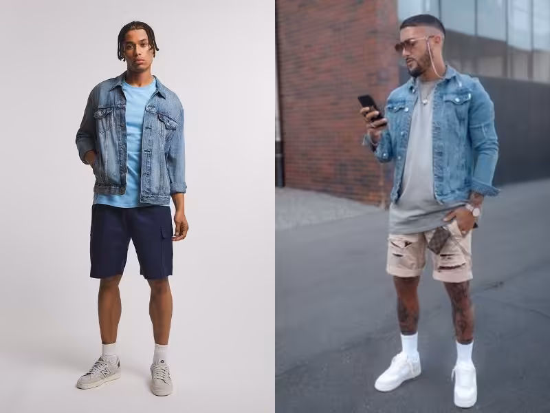 Áo khoác denim mang đến sự trẻ trung, bụi bặm khi mix cùng quần đũi. Bên trong có thể mặc áo thun hoặc áo tanktop. Thêm sneaker trắng hoặc giày slip-on để set đồ cân đối, thoải mái.
