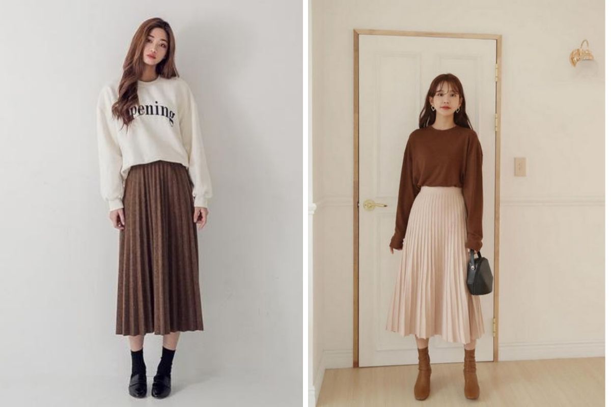 Áo sweater dáng rộng mix cùng chân váy dài xếp ly tạo nên vẻ đáng yêu và ấm áp. Bạn có thể chọn tone màu pastel để thêm phần ngọt ngào.