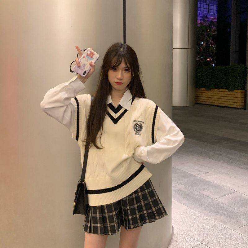Một chiếc sơ mi trắng cổ điển kết hợp áo gile len và chân váy dài sẽ mang đến vẻ đẹp của nữ sinh học đường Trung Hoa. Bạn có thể mix cùng túi xách và giày sneakers để hoàn thiện outfit.