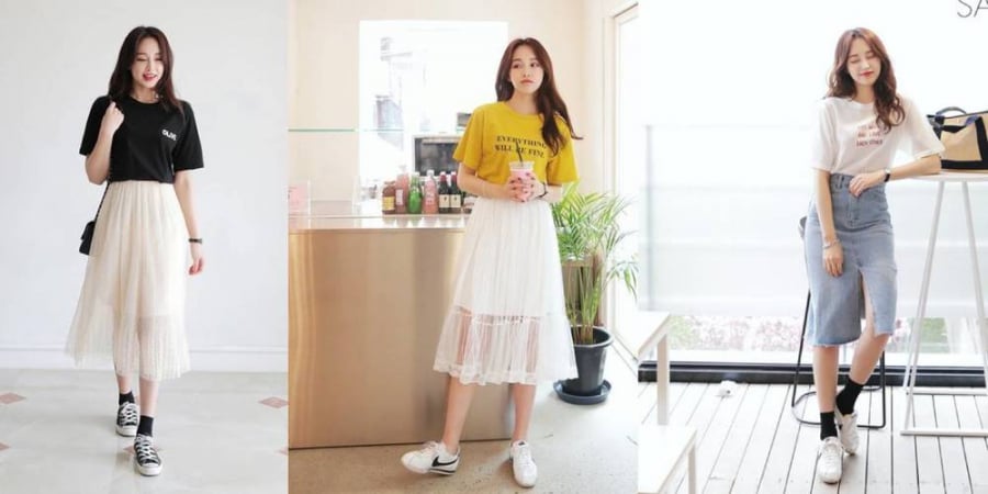 Áo thun dáng ngắn phối chân váy dài xếp ly tạo nên sự cân đối hoàn hảo giữa cá tính và nữ tính. Đây là lựa chọn hoàn hảo cho những cô nàng muốn hack chiều cao. Kết hợp với sneaker trắng hoặc sandal cao gót sẽ làm tổng thể càng ấn tượng.