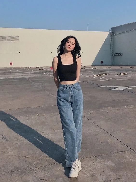 Nếu bạn thích sự đơn giản mà vẫn nổi bật, hãy thử áo hai dây kết hợp cùng quần jeans dáng suông hoặc baggy.