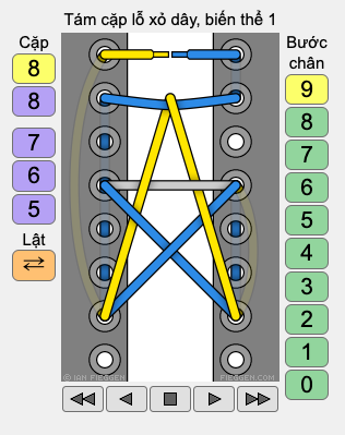 Xỏ ngang đầu dây trái từ lỗ 7 bên trái qua lỗ 7 bên phải theo hướng từ trên xuống.