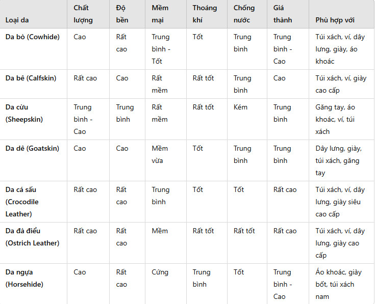 Nhìn chung, da thật luôn có độ bền cao, càng sử dụng càng đẹp theo thời gian. Tuy nhiên, tùy vào loại da động vật, chúng sẽ có những tính chất khác nhau. Như da cá sấu có bề mặt gồ ghề, vân da tự nhiên độc đáo, đem lại vẻ ngoài sang trọng và giá trị cao. Còn da bò thì mềm mại, có kết cấu vân đều và dễ gia công, phù hợp với các sản phẩm như túi, ví, thắt lưng,...