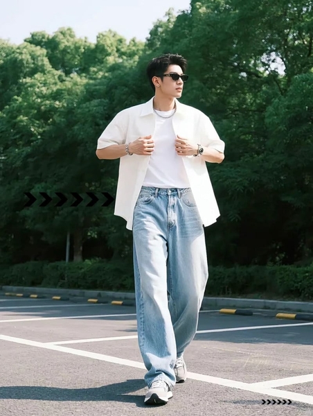 Nam giới có vóc dáng cao gầy nên ưu tiên quần jeans ống rộng có độ phồng vừa phải để tạo cảm giác cân đối. Những gam màu sáng hoặc wash nhẹ sẽ giúp tổng thể trở nên đầy đặn hơn. Khi phối đồ, nên kết hợp cùng áo có form rộng hoặc oversize để tạo sự hài hòa. Tránh những item quá ôm sát vì sẽ làm lộ khuyết điểm cơ thể.