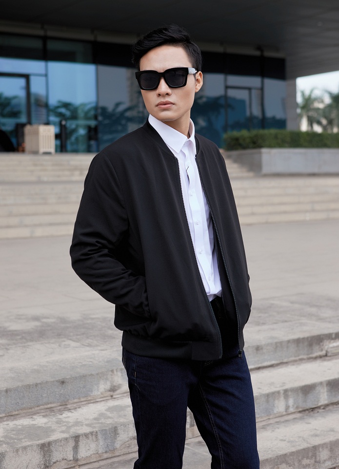 Một chiếc bomber nylon đen kết hợp quần jeans slim fit xanh đậm sẽ mang đến vẻ ngoài gọn gàng, năng động. Bạn có thể mix thêm sneaker trắng và áo thun basic bên trong để tạo cảm giác trẻ trung, phù hợp đi học hoặc đi chơi cuối tuần.
