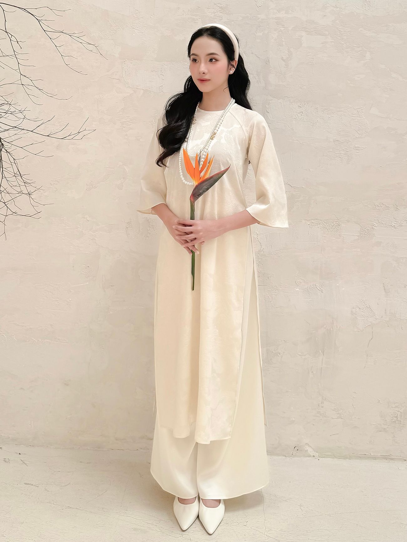 Quần kem, be sữa hay nude nhạt là lựa chọn nhẹ nhàng và nền nã cho áo dài trắng. Cách phối này tạo sự mềm mại và nữ tính, thích hợp với các buổi lễ hoặc những buổi chụp ảnh ngoài trời.