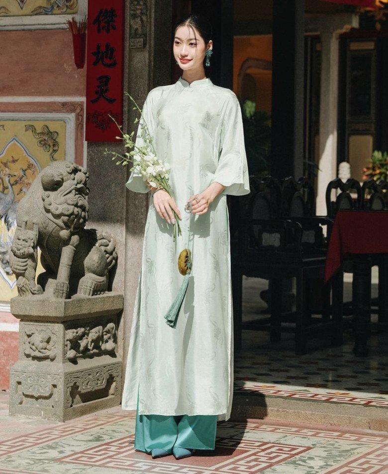 Áo dài trắng phối cùng quần xanh ngọc mang lại cảm giác thanh khiết nhưng không nhàm chán, rất phù hợp với những cô gái yêu sự mới mẻ và thích làm nổi bật bản thân theo cách tinh tế. Kết hợp cùng giày cao gót mũi nhọn màu nude, hoa tai bạc dáng nhỏ, bạn sẽ có ngay một outfit vừa dịu dàng vừa hiện đại.