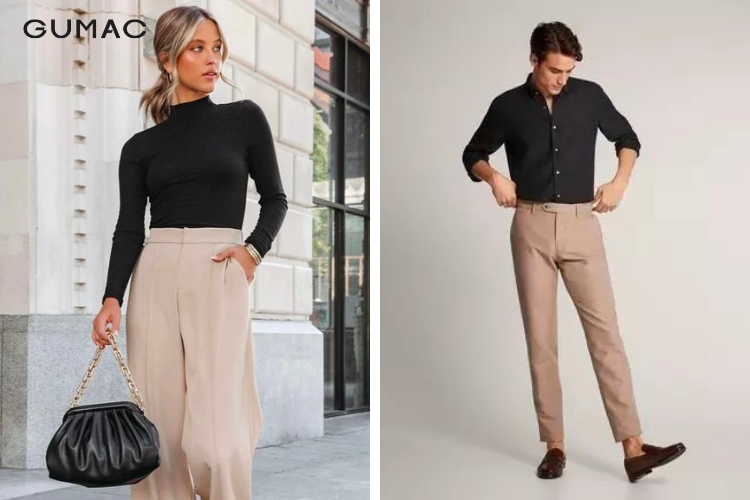 Nếu bạn muốn diện áo đen nhưng vẫn giữ vẻ mềm mại, hãy thử kết hợp với quần màu be hoặc màu kem. Tông màu trung tính này giúp làm dịu bớt sự cứng cáp của sắc đen, mang đến vẻ ngoài thanh lịch nhưng không quá nghiêm túc. Phối cùng giày loafer, clutch hoặc kính mắt là đủ tạo điểm nhấn.