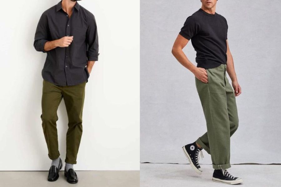 Đây là lựa chọn dành cho những ai không ngại phá cách. Màu xanh rêu hoặc xanh olive mang cảm giác “military” mạnh mẽ, khi kết hợp cùng áo đen sẽ tạo ra outfit rất cá tính và nam tính. Với nữ giới, bạn có thể chọn dáng quần cargo hoặc baggy, thêm giày cao gót hoặc túi hình học để tăng phần nổi bật.