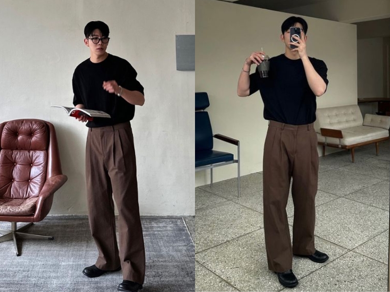 6. Áo đen phối quần màu nâu
