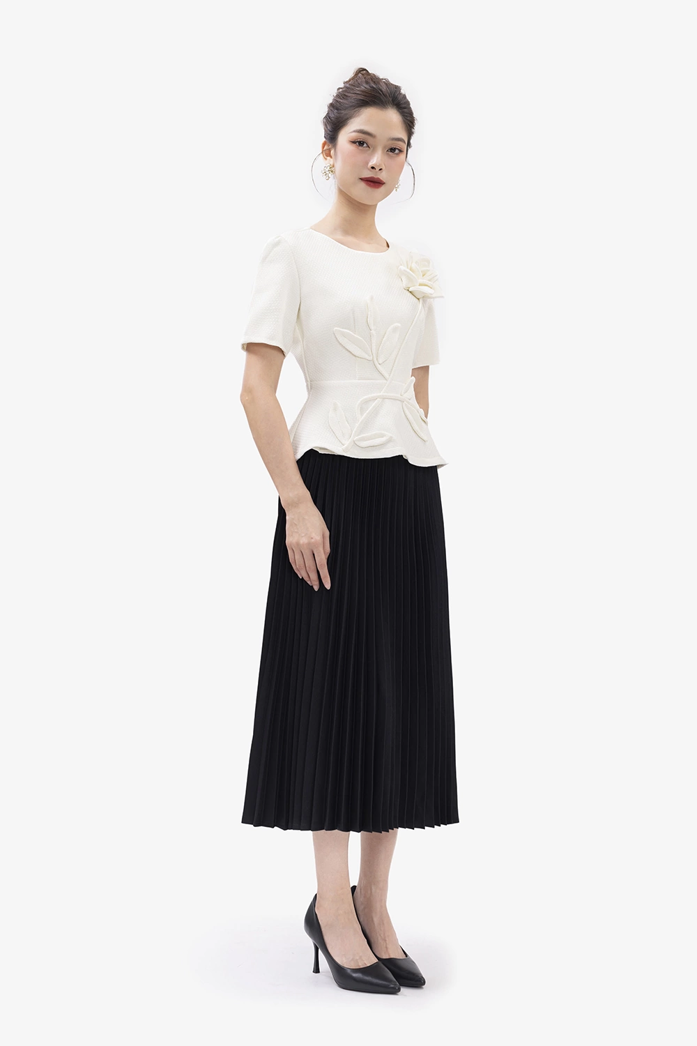 Với chân váy xếp ly dáng dài hoặc midi, áo peplum mang đến một tổng thể dịu dàng, đậm chất Hàn Quốc.