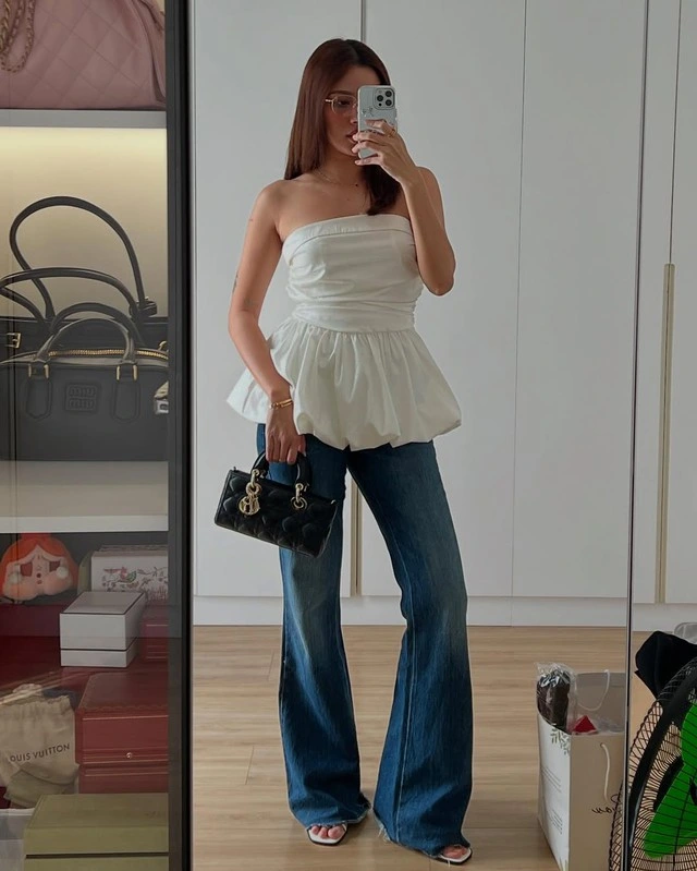 Sự kết hợp giữa nét cổ điển của áo peplum và phong cách hiện đại, trẻ trung của quần jeans mang lại diện mạo năng động mà vẫn giữ được sự chỉn chu.