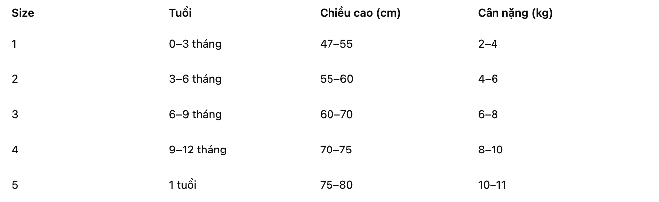 Dựa vào thông số đo được, đối chiếu với bảng size theo chiều cao và cân nặng. Nếu bé ở giữa 2 size, hãy ưu tiên size lớn hơn để bé có thể mặc lâu dài và thoải mái hơn.