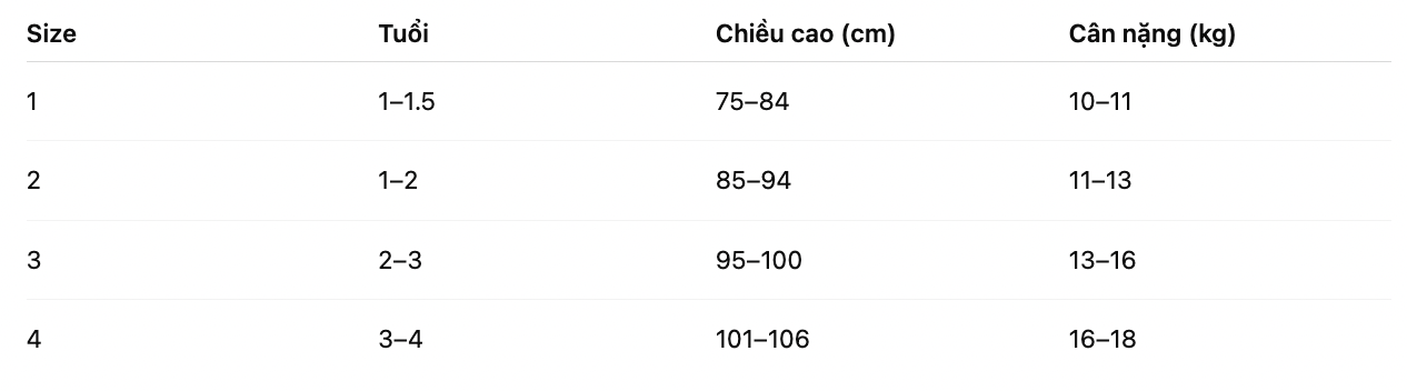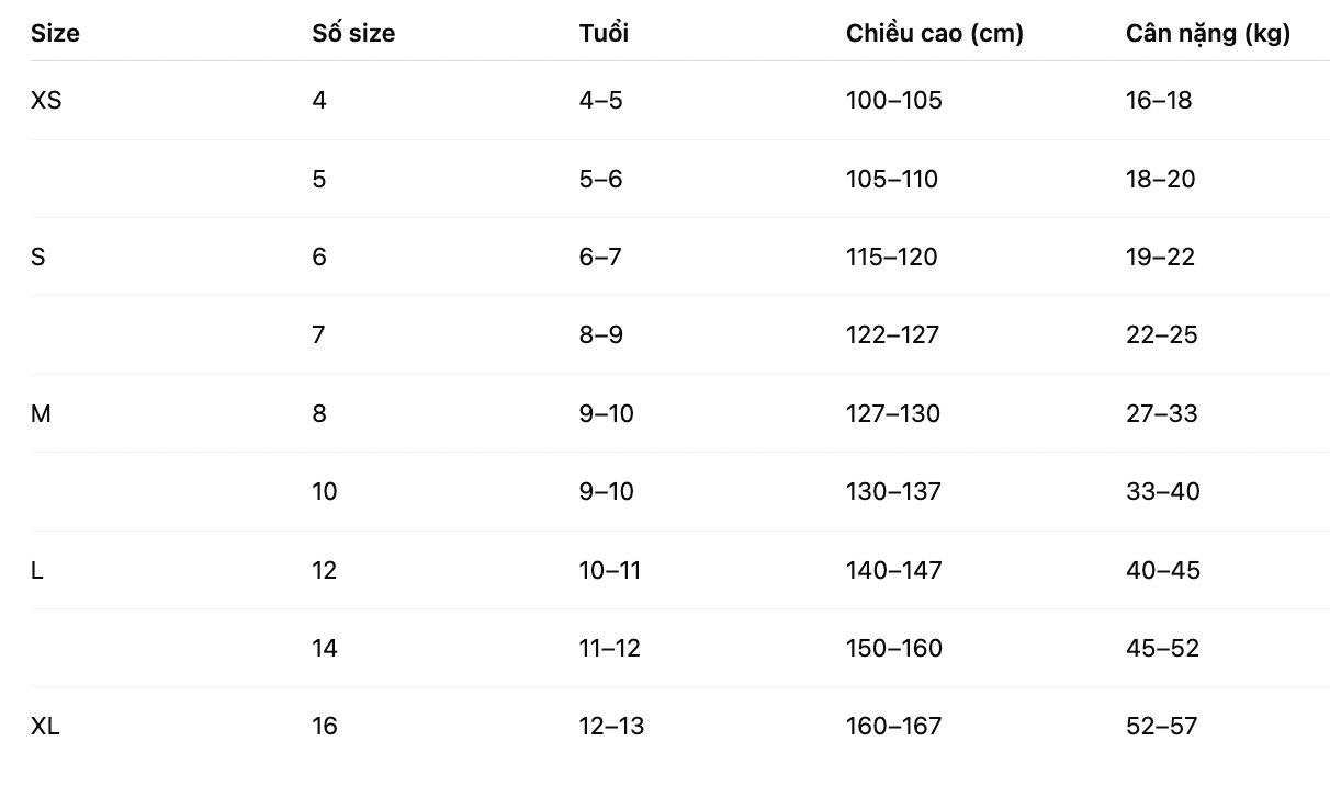 A: Theo bảng size cập nhật 2025, size M thường phù hợp với bé từ 4–5 tuổi, cao khoảng 105–115cm và nặng từ 16–20kg. Tuy nhiên, vẫn nên đo cụ thể chiều cao và cân nặng để đối chiếu chính xác.