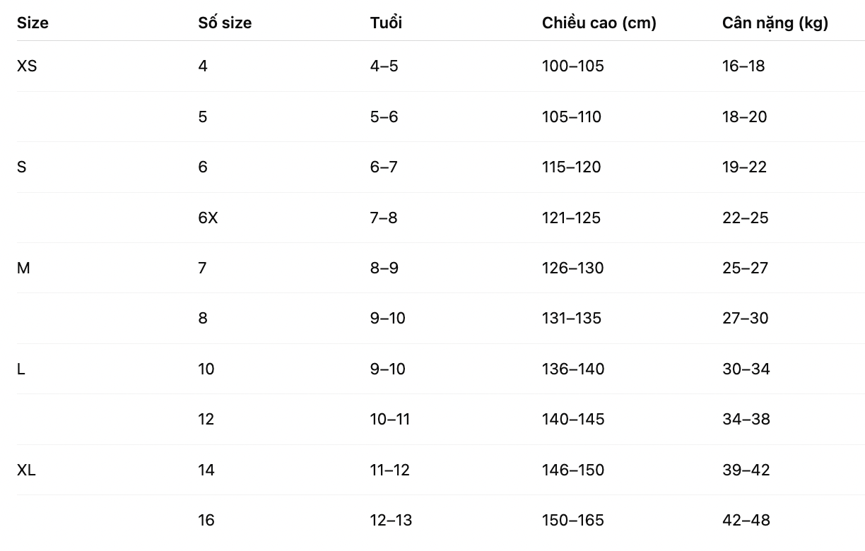 Bố mẹ nên ưu tiên kiểm tra số đo thực tế và chọn size theo bảng quy chuẩn về tuổi, chiều cao, cân nặng – đặc biệt từ 5 tuổi trở đi, cần lưu ý đến sự khác biệt giữa bé trai và bé gái.