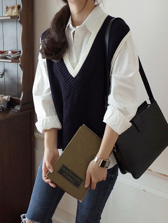 Sự kết hợp giữa áo gile len và áo sơ mi trắng là một công thức kinh điển, mang đến vẻ ngoài thanh lịch, phù hợp cho môi trường công sở hoặc dạo phố. Hãy chọn áo gile len cổ V để tôn lên đường nét cổ và khuôn mặt. Kết hợp với quần jeans ống suông hoặc skinny để tạo sự cân đối.