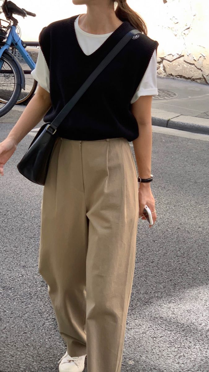 Quần ống rộng kết hợp với áo gile len và áo sơ mi tay phồng là lựa chọn hoàn hảo cho các cô nàng công sở. Set đồ này không chỉ tôn dáng mà còn mang lại vẻ ngoài chuyên nghiệp, hiện đại.