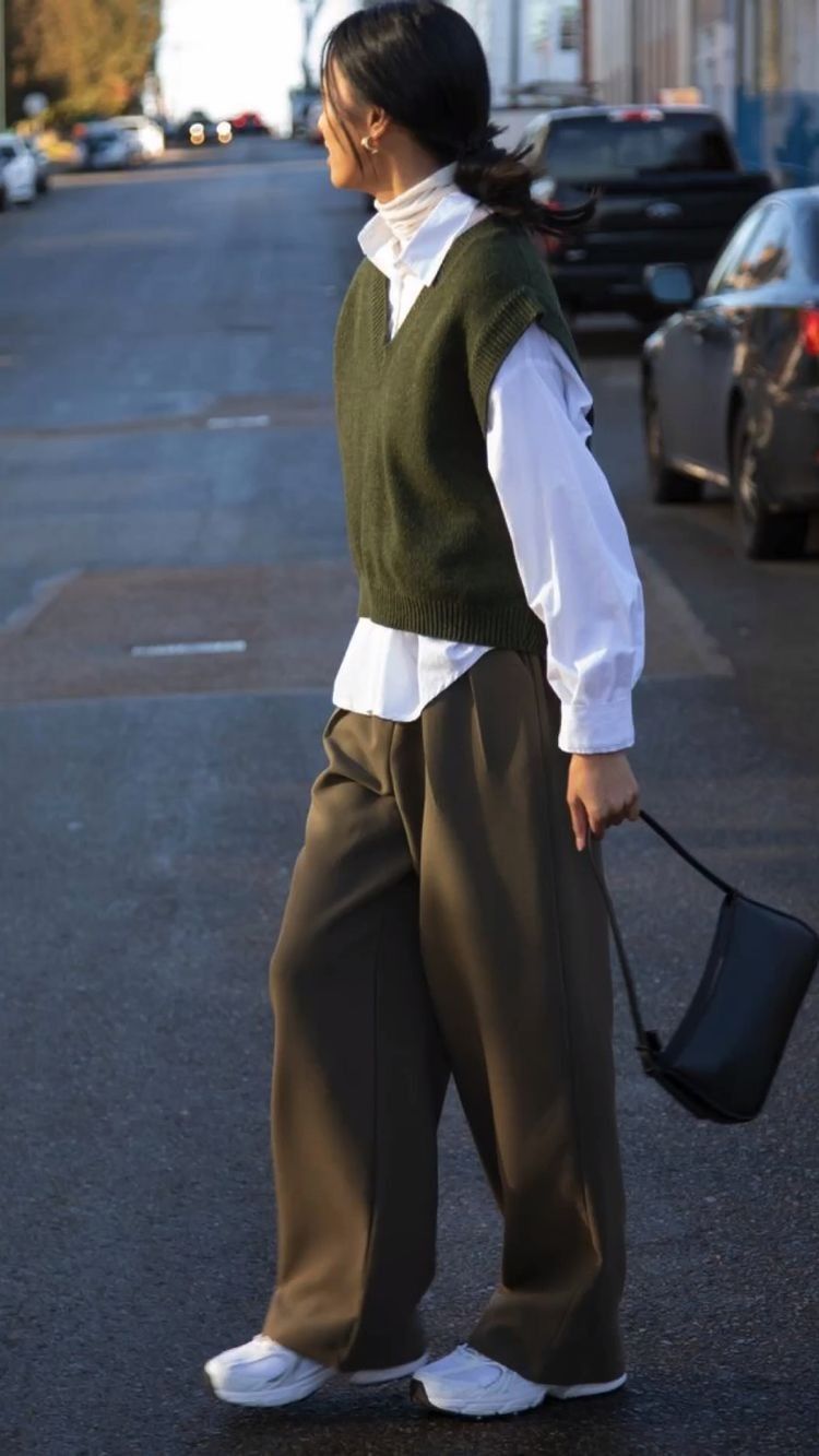 Quần ống rộng kết hợp với áo gile len và áo sơ mi tay phồng là lựa chọn hoàn hảo cho các cô nàng công sở. Set đồ này không chỉ tôn dáng mà còn mang lại vẻ ngoài chuyên nghiệp, hiện đại.