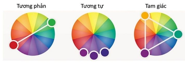 Màu bộ ba (Triadic Colors): Gồm ba màu cách đều nhau trên bánh xe màu sắc, tạo thành hình tam giác đều (ví dụ: đỏ - vàng - xanh dương). Cách phối này mang lại sự cân bằng, sống động và trẻ trung.