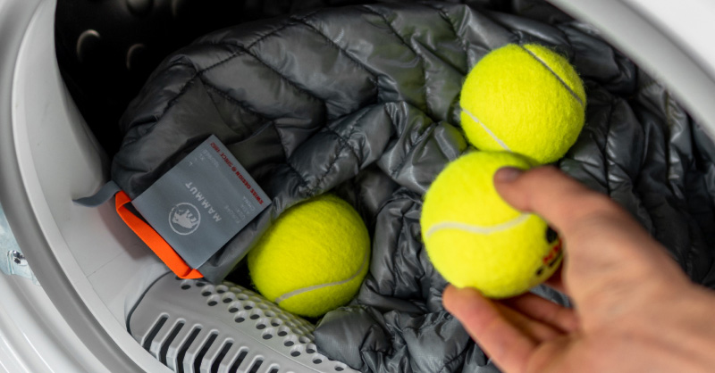 Bước 1: Cho áo vào lồng giặt cùng 2–3 quả bóng tennis sạch hoặc bóng giặt chuyên dụng. Những quả bóng này sẽ giúp áo giữ được độ phồng, tránh tình trạng lông bị vón cục.
