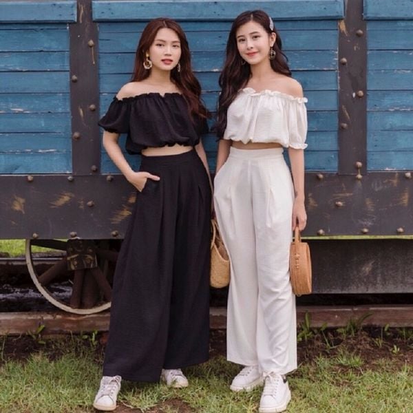 Set đồ này mang đến cảm giác thoải mái và thời thượng. Áo trễ vai ôm nhẹ phần trên phối cùng quần ống rộng giúp tôn chiều cao, đặc biệt khi mix thêm thắt lưng bản nhỏ và giày cao gót.