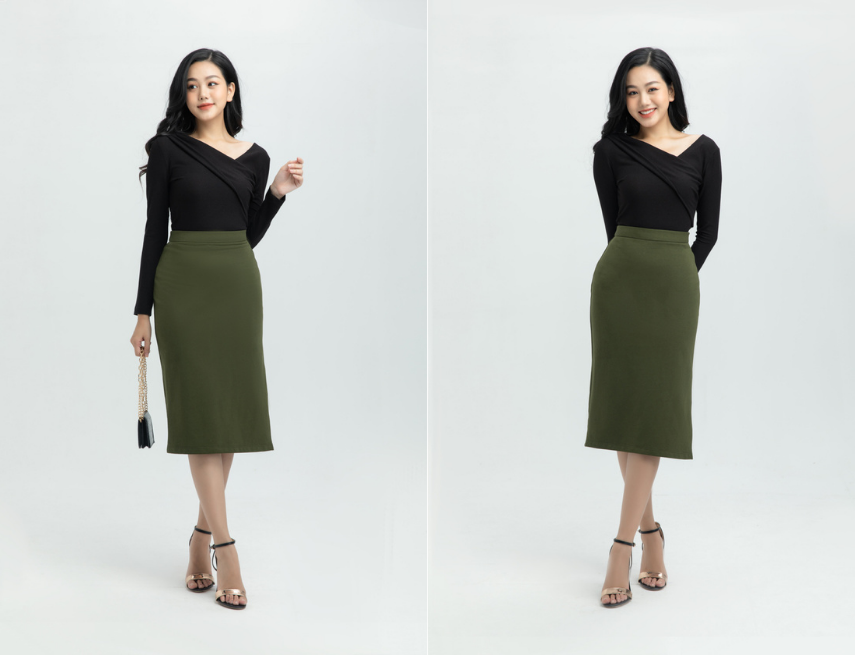 Váy bút chì ôm sát tôn dáng kết hợp áo trễ vai sẽ là lựa chọn hoàn hảo cho những buổi tiệc tối hoặc sự kiện sang trọng. Kết hợp cùng giày cao gót và clutch nữ thời trang để hoàn thiện outfit.