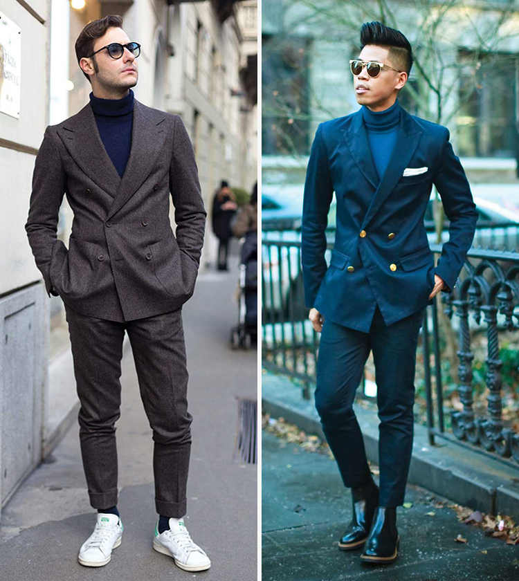 Với những ngày cần sự trang trọng nhưng vẫn muốn giữ ấm, bạn có thể thay sơ mi bằng áo len cổ lọ mỏng mặc trong bộ suit. Kết hợp này vừa thời thượng lại mang hơi hướng châu Âu cổ điển, rất phù hợp với môi trường văn phòng hay họp hành.