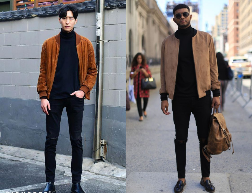 Sự kết hợp giữa áo bomber và áo len cổ lọ tạo nên phong cách nam tính pha chút bụi bặm. Bạn có thể chọn bomber dáng rộng, phối cùng quần jeans và sneaker trắng, thêm một chiếc balo nam da thật để hoàn thiện outfit.