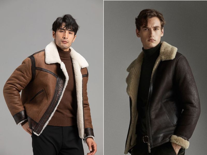 Kết hợp áo len cổ lọ bên trong áo khoác shearling (áo da lót lông cừu) tạo nên vẻ ngoài mạnh mẽ, thời thượng. Áo len tông sáng như trắng kem, xám nhạt sẽ cân bằng sự “bụi bặm” của shearling jacket.
