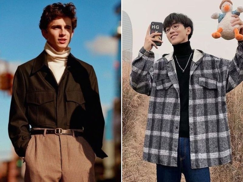 Một cách phối đầy mới mẻ là diện áo sơ mi dày (flannel hoặc denim) như một lớp áo khoác nhẹ bên ngoài áo len cổ lọ.