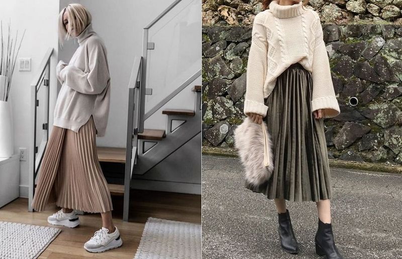 2.3 Áo len cổ lọ + Chân váy midi xếp ly