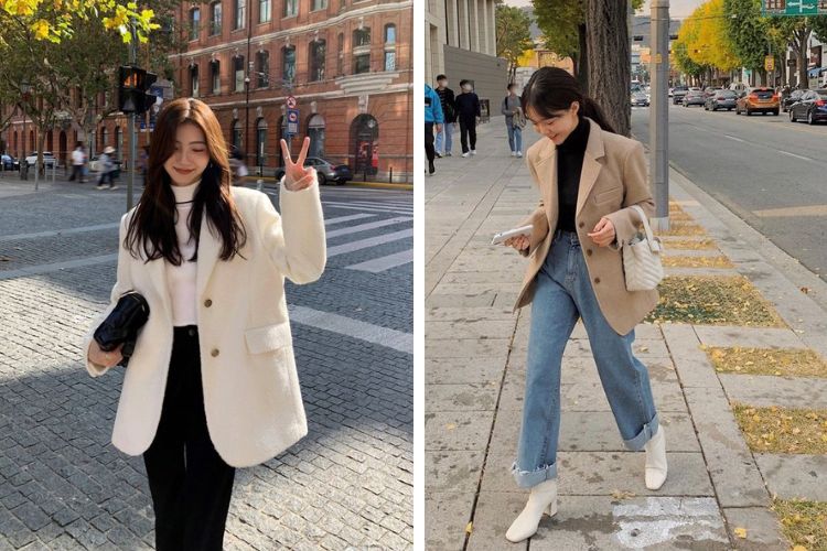 Một combo đơn giản nhưng luôn gây ấn tượng bởi vẻ ngoài thanh lịch. Áo len cổ lọ mỏng màu trung tính mặc trong áo blazer dáng suông giúp bạn trông vừa nghiêm túc vừa thời trang.