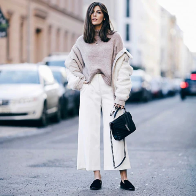 Sự kết hợp giữa ba item này tạo nên tổng thể thanh lịch, phù hợp với những ngày lạnh hơn. Culottes thoải mái, áo khoác lông giúp tăng vẻ ngoài thời thượng, và áo cổ lọ đảm bảo sự gọn gàng trong từng chi tiết.