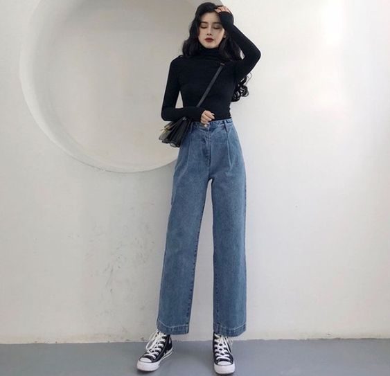 Chiếc áo len cổ lọ basic khi kết hợp cùng quần jean ống suông sẽ tạo cảm giác trẻ trung và khỏe khoắn. Để bộ trang phục thêm cá tính, bạn có thể chọn một đôi boots da cao cổ và một chiếc túi xách nữ đeo vai thời trang cỡ vừa. Outfit này phù hợp cho cả dạo phố lẫn đi làm.
